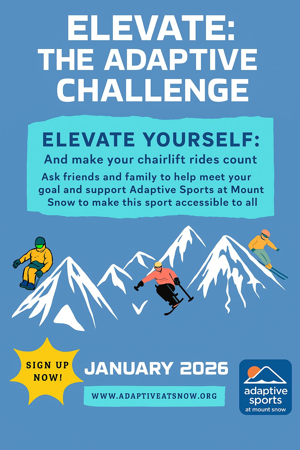 Help us ELEVATE the awareness of ASMS by riding as many chairlifts as you can during the month of January and spread the word about Adaptive Sports! Stop into the Adaptive Office in the Ski School Discovery Building for a free Adaptive sticker for all ELEVATE participants and fundraisers.